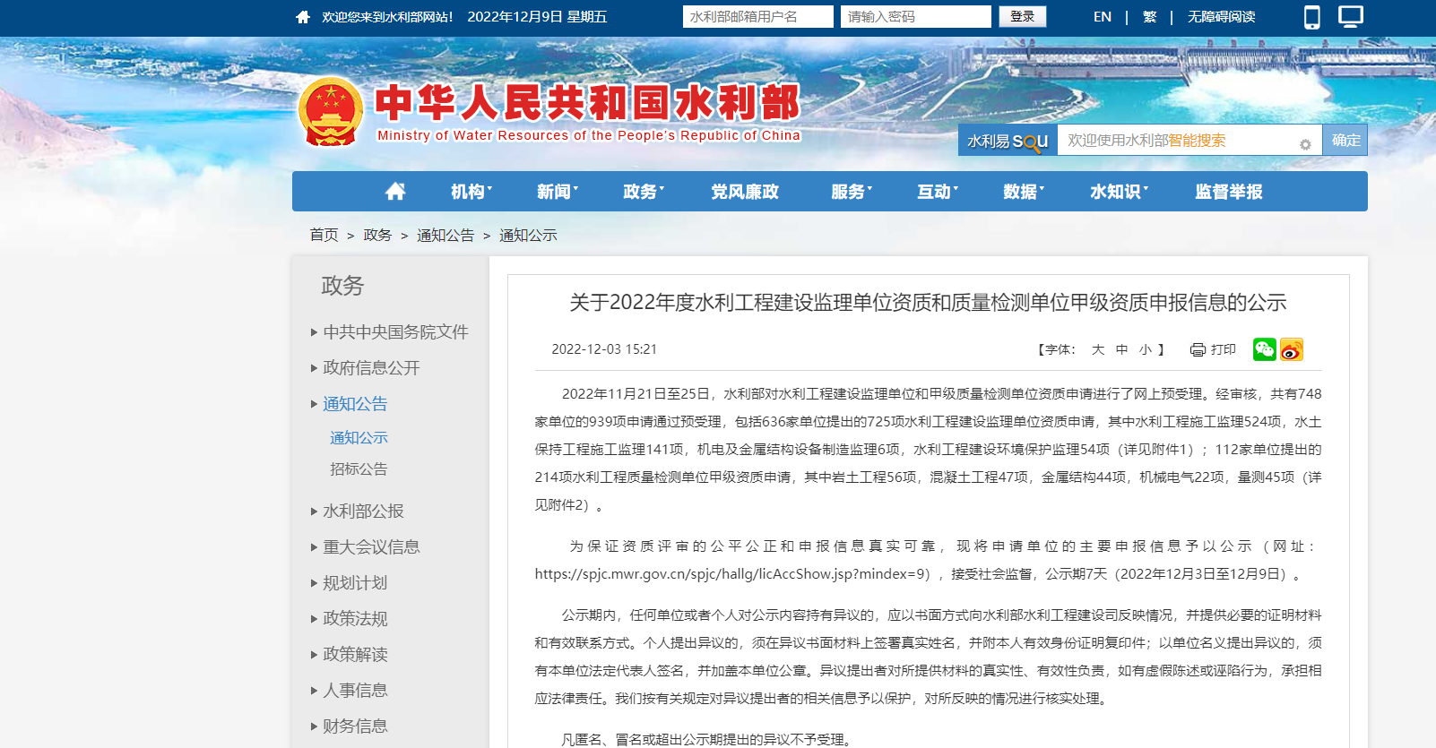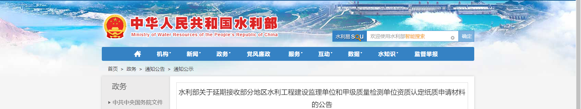 水利部關(guān)于延期接收部分地區(qū)水利工程建設(shè)監(jiān)理單位和甲級(jí)質(zhì)量檢測單位資質(zhì)認(rèn)定紙質(zhì)申請(qǐng)材料的公告 2022-12-01
